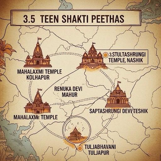 There exist the popular 3 and Half Shakti Peeths – Saptashrungi, Tuljapur, Mahur, and Kolhapur in Maharashtra.